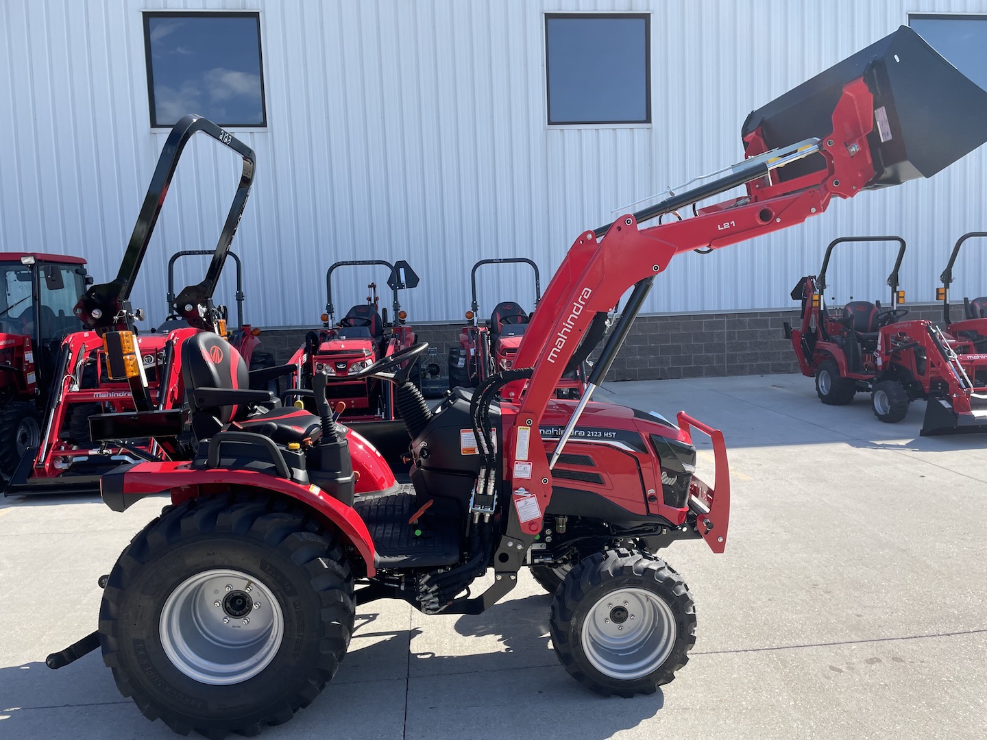 This is the all new Mahindra 2123. This extremely user friendly and comfortable 23 HP tractor comes with a loader, a skid steer quick attach bucket, R4 tires, twin touch HST pedals, a three range HST transmission, a push button PTO,  a 4-in-1 quick connect loader hose hookup, a fender mounted joystick, a HD brush guard, a 1,477 Lb. Loader lift capacity, FAST hydraulics, and so much more.